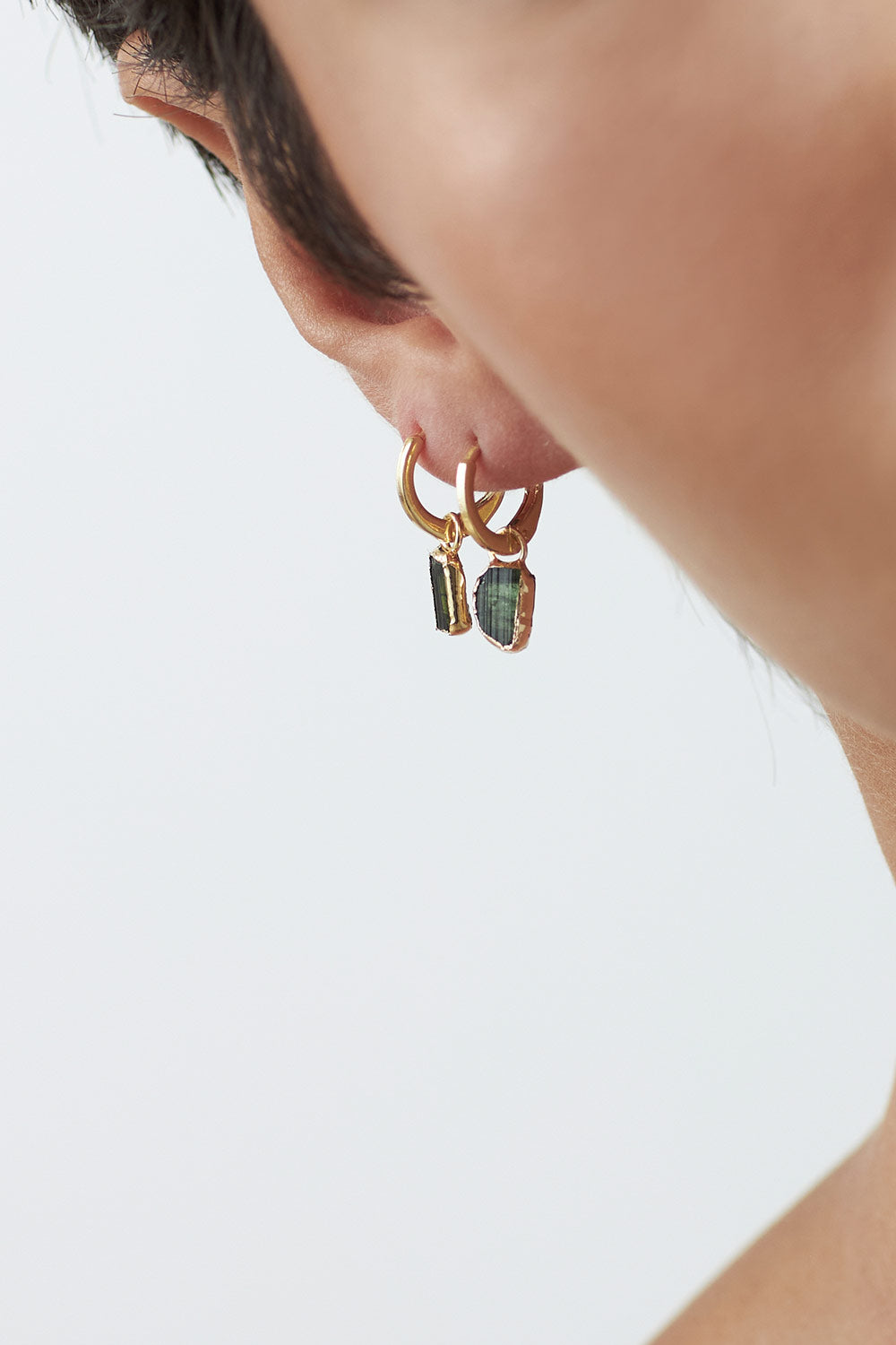 The Prana Earrings pair clean, polished hoops with a suspended rectangular green tourmaline, creating a refined balance of structure and movement. Handcrafted in Brazil and finished in luminous 18k gold plating, the design feels architectural yet light, offering a composed silhouette that moves subtly with the wearer.